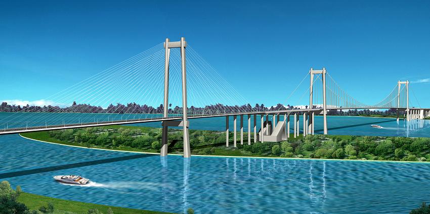 廣州珠江黃埔大橋是交通部規(guī)劃的“五縱七橫”中京珠國道主干線廣州繞城公路的東段,全長19.7km。其主橋由南汊橋、北汊橋組成。南汊橋為單跨地錨式鋼箱梁懸索橋,主纜分跨為290m+1108m+350m,主梁采用扁平流線型全焊加勁鋼箱梁,梁總寬41.69m,頂板寬34.5m,底板寬28.3m,梁高3.5m,全橋共87個梁段,標準梁段長12.8m,重北汊橋為獨塔雙索面鋼箱梁斜拉橋,跨度為383m+322m。主梁采用單箱三室扁平流線型鋼箱梁,橋面凈寬34.5m,外設0.75m寬的斜拉索錨固區(qū),風嘴寬2.0m,梁全寬40m,梁高3.5m,全橋共52個梁段,標準梁段長16m,重330t。