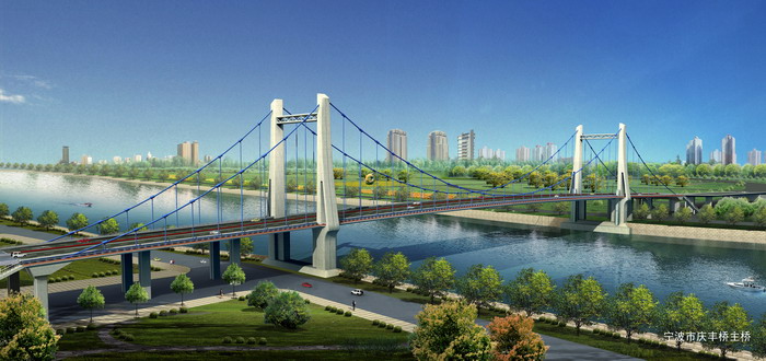 寧波市慶豐大橋及連接線工程西起湖濱路(清河路與大慶南路之間),東至中興路。慶豐橋主橋為三跨雙塔雙索面自錨式懸索橋,總長約1747米,由引橋、主跨和邊跨組成;其中橫跨甬江的主跨橋面長280米、寬41米,跨徑在目前國內在建的同類橋梁中名列第一,在世界上排第三;兩岸又各有三個邊跨,總長217.7米。主橋的設計極富現代感,與寧波這座快速發展的都市相互呼應,三跨雙索不僅在白天搶人眼球,夜間更是熠熠生輝,為寧波增添又一抹亮色。慶豐橋將是寧波的第一座懸索橋,同時也是繼甬江大橋(1991年建成)后連接江北和江東的第二座大橋。