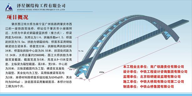 肇慶西江特大橋主橋為中承式鋼箱梁提籃式拱橋。拱腳中心距450m,設計矢跨比為1/4,橋面距拱頂73.5m,橋面系采用鋼縱橫梁結合梁體系。
